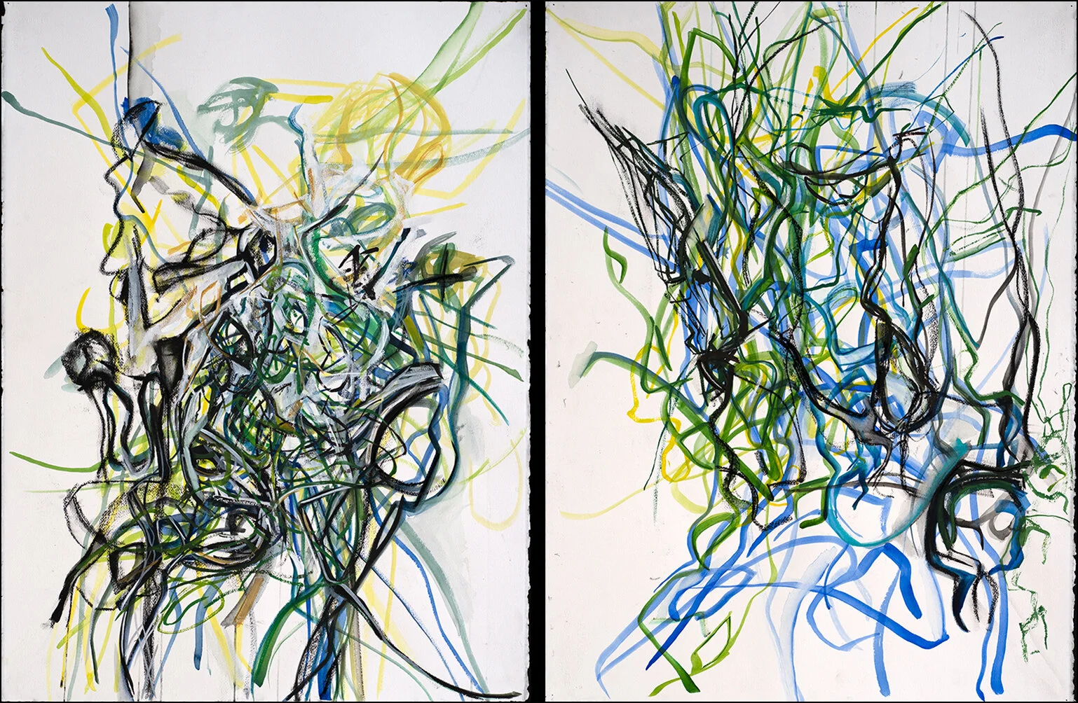In my works on paper (2017-2019), I am drawing the sum of forms from the human figure on a page. I’m interested in the relationships created by the different forms, lines, and colors bringing about a uniquely personal reality. Sometimes I draw from the model, fusing three hours of poses onto one piece of paper and sometimes from a dancer, recording the consecutive movement of forms. I start with thinner marks, adding weight and color as the poses progress. Intuition plays an important role in terms of where and how the figure will be placed. I allow myself to work fast and to erase frequently. Contours appear and disappear defining a set of shifting rhythms and tensions. Ultimately, I want to hold multiple visual experiences in space compressed into a single moment.